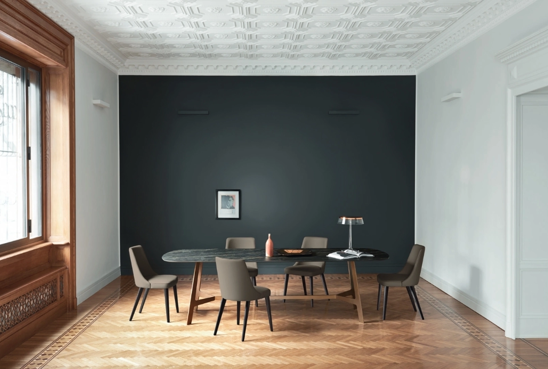 Tavolo Vertigo Noir Desir di Sangiacomo: realizzato in materiali durevoli è connotato dalle linee decise del top e da un basamento elegante e sofisticato. Se desideri un tavolo da pranzo di grande design, contattaci e ricevi informazioni e preventivi sul modello visibile in foto. Il rinomato brand Sangiacomo, specialista nella realizzazione di arredi in ceramica, ha scelto per la sua linea un'infinità di materiali, forme e tonalità. Un modello come quello nell'immagine, in abbinamento alle giuste sedute, saprà arricchire il look delle stanze domestiche dedicate in assoluto alla convivialità.