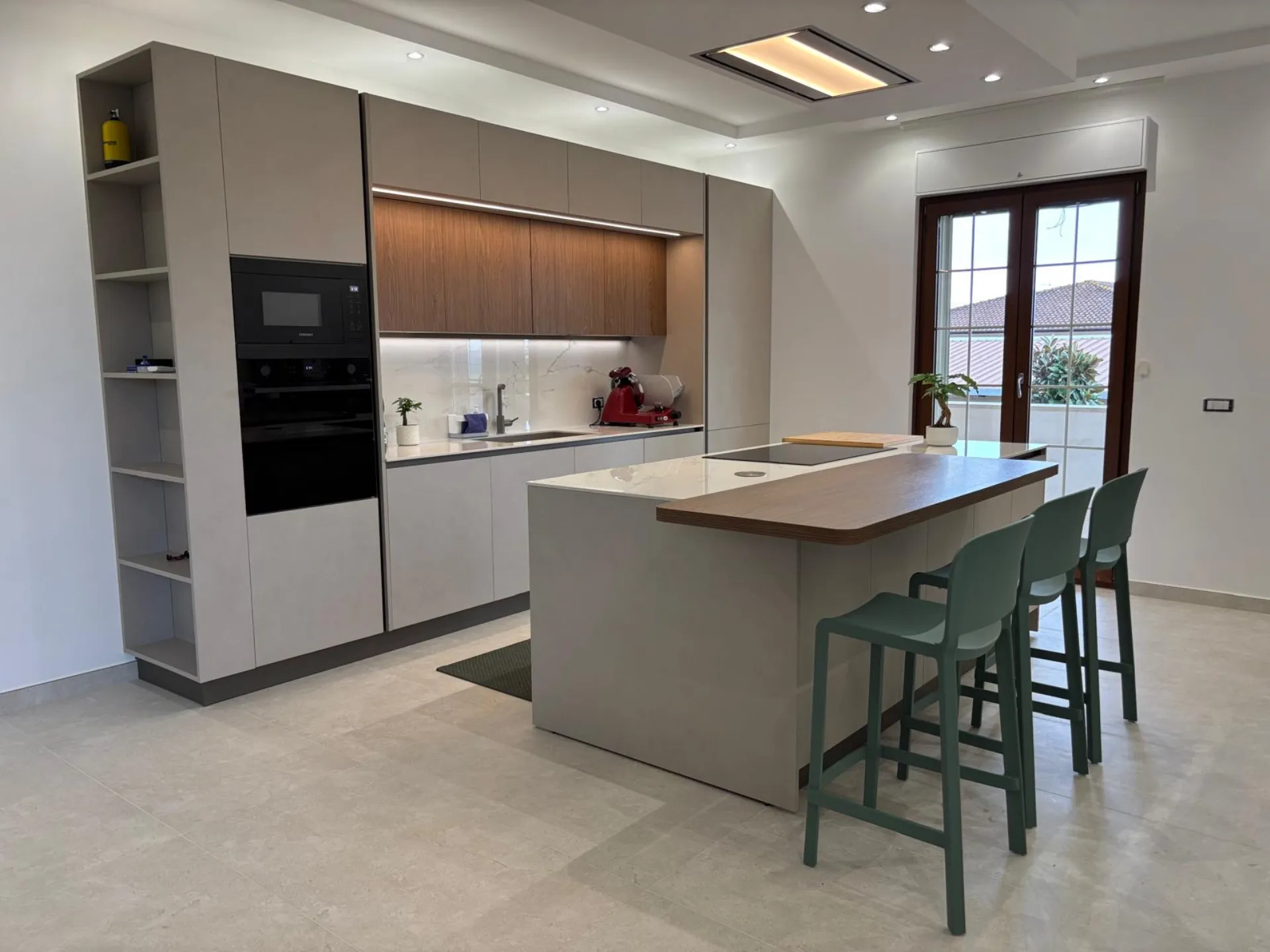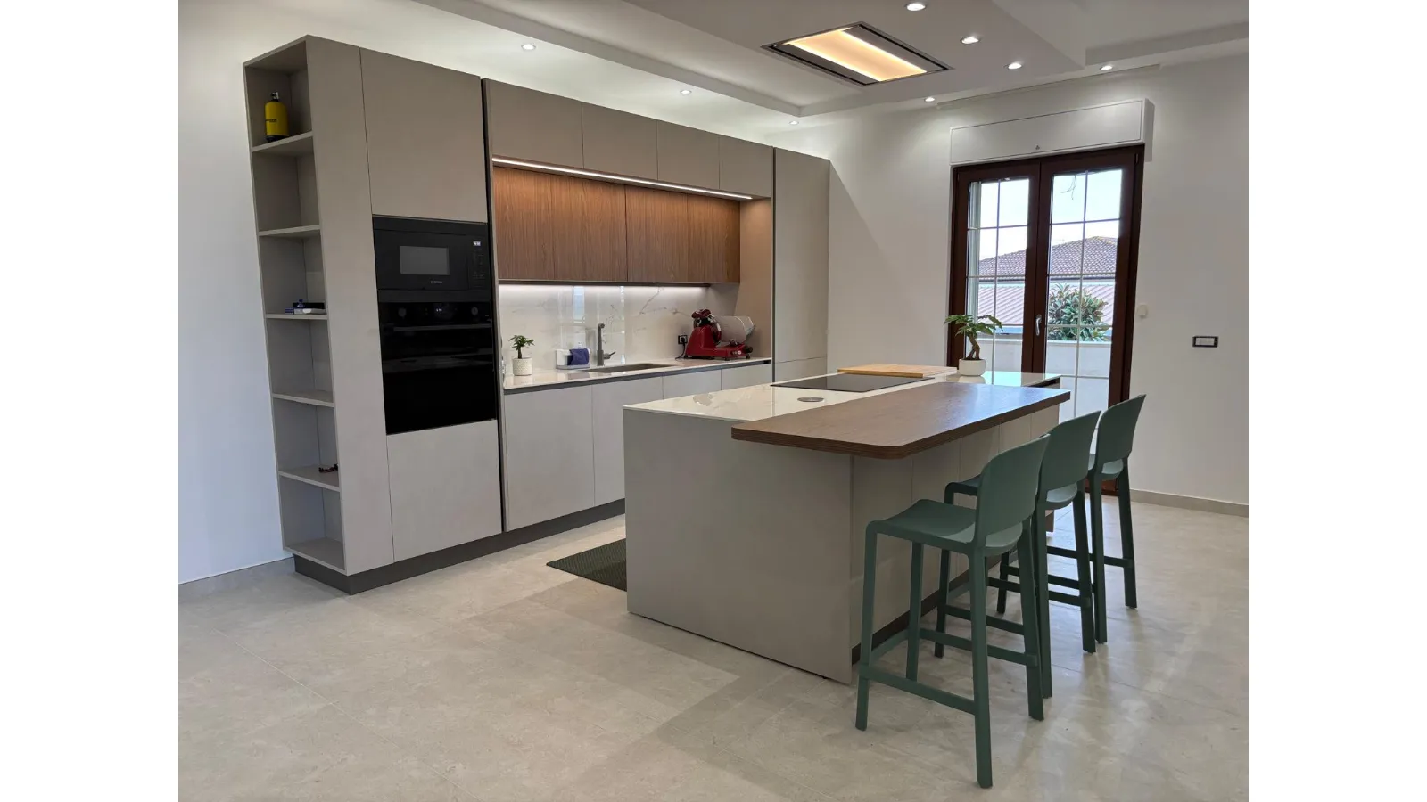 Il top e lo schienale, realizzati in pregiata ceramica, garantiscono resistenza e continuità estetica. L’isola, fulcro dell’ambiente, ospita il piano cottura a induzione; una scelta resa ancora più ariosa dalla cappa integrata nel controsoffitto, che libera la visuale e apre lo spazio. Completa la composizione un funzionale piano snack in legno, ideale per la quotidianità.