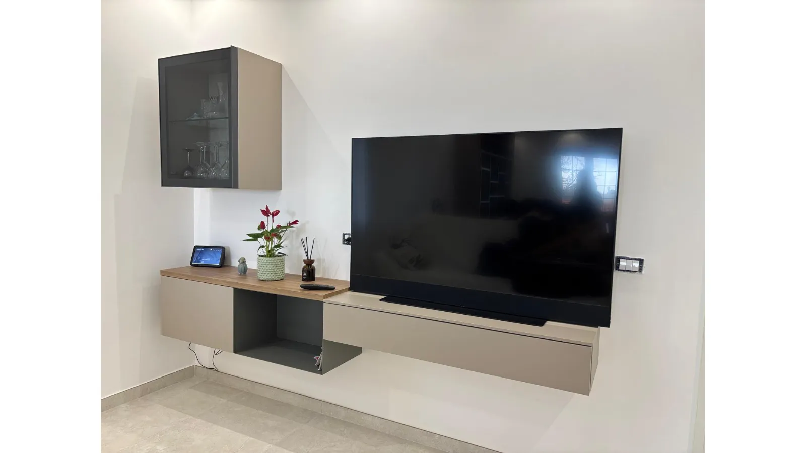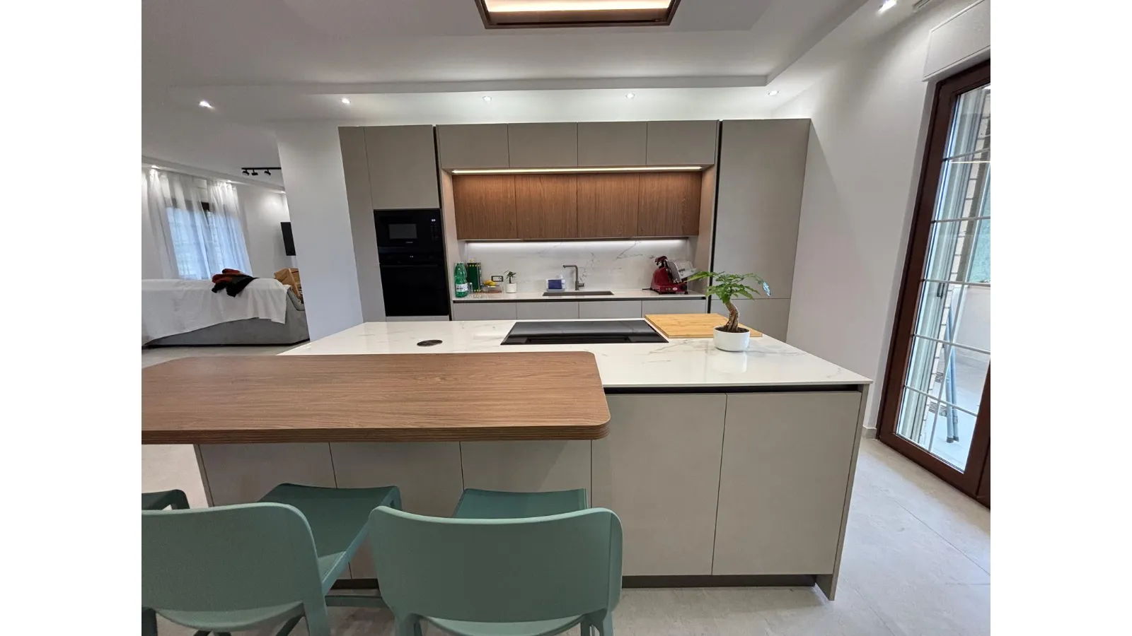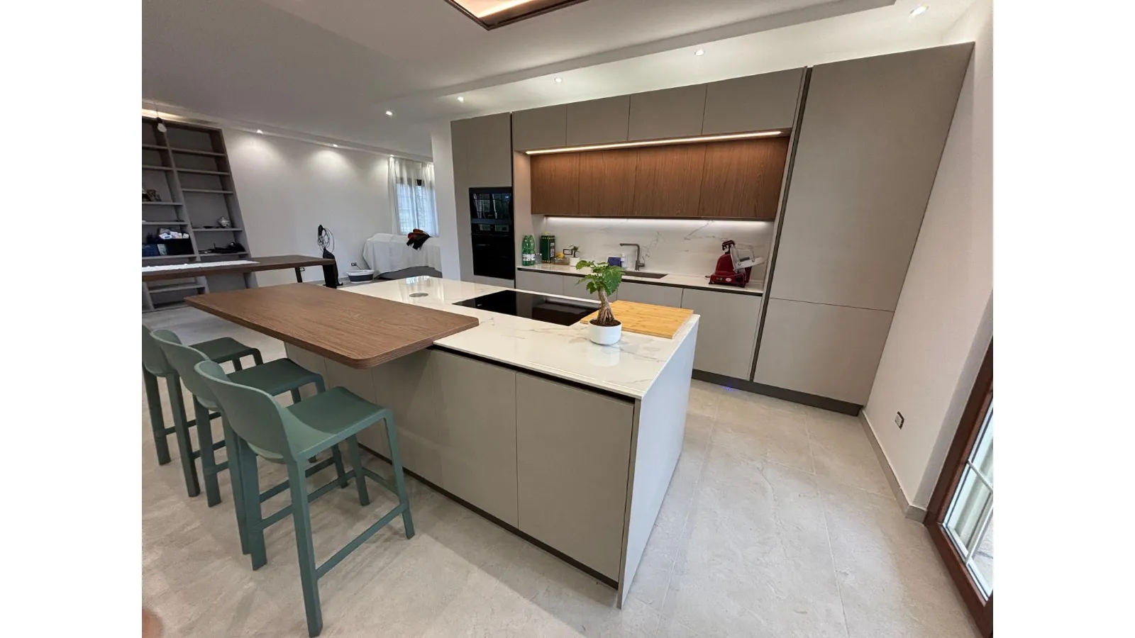 La coerenza stilistica prosegue nella parete attrezzata, che richiama le finiture della cucina arricchendosi di dettagli distintivi: una vetrinetta raffinata e un tocco di verde che dona freschezza e personalità all'intero living.