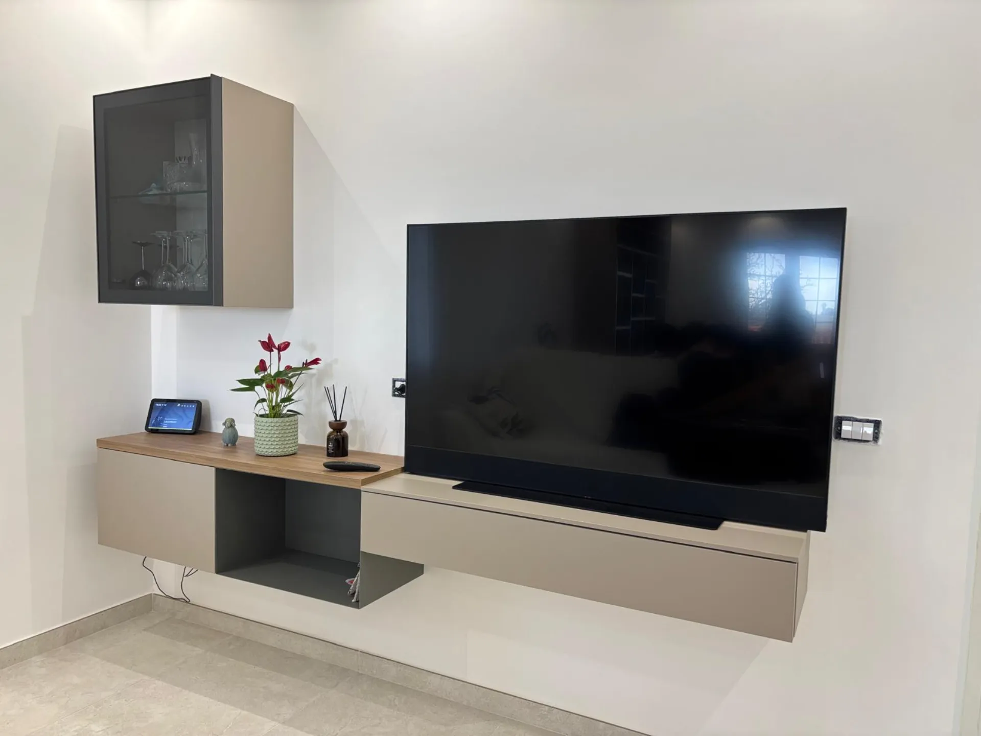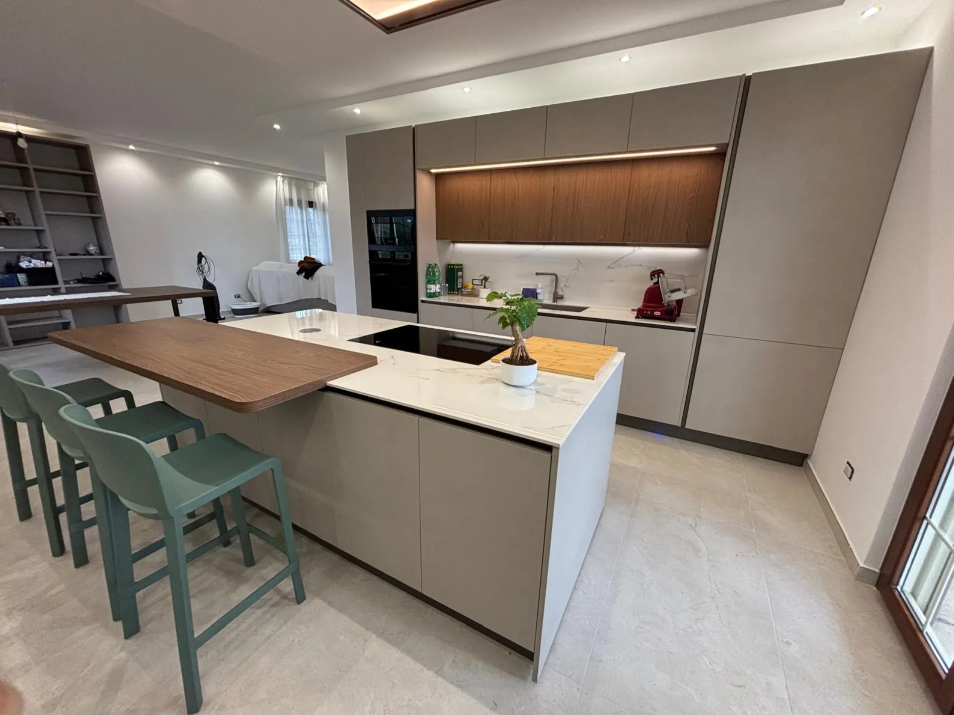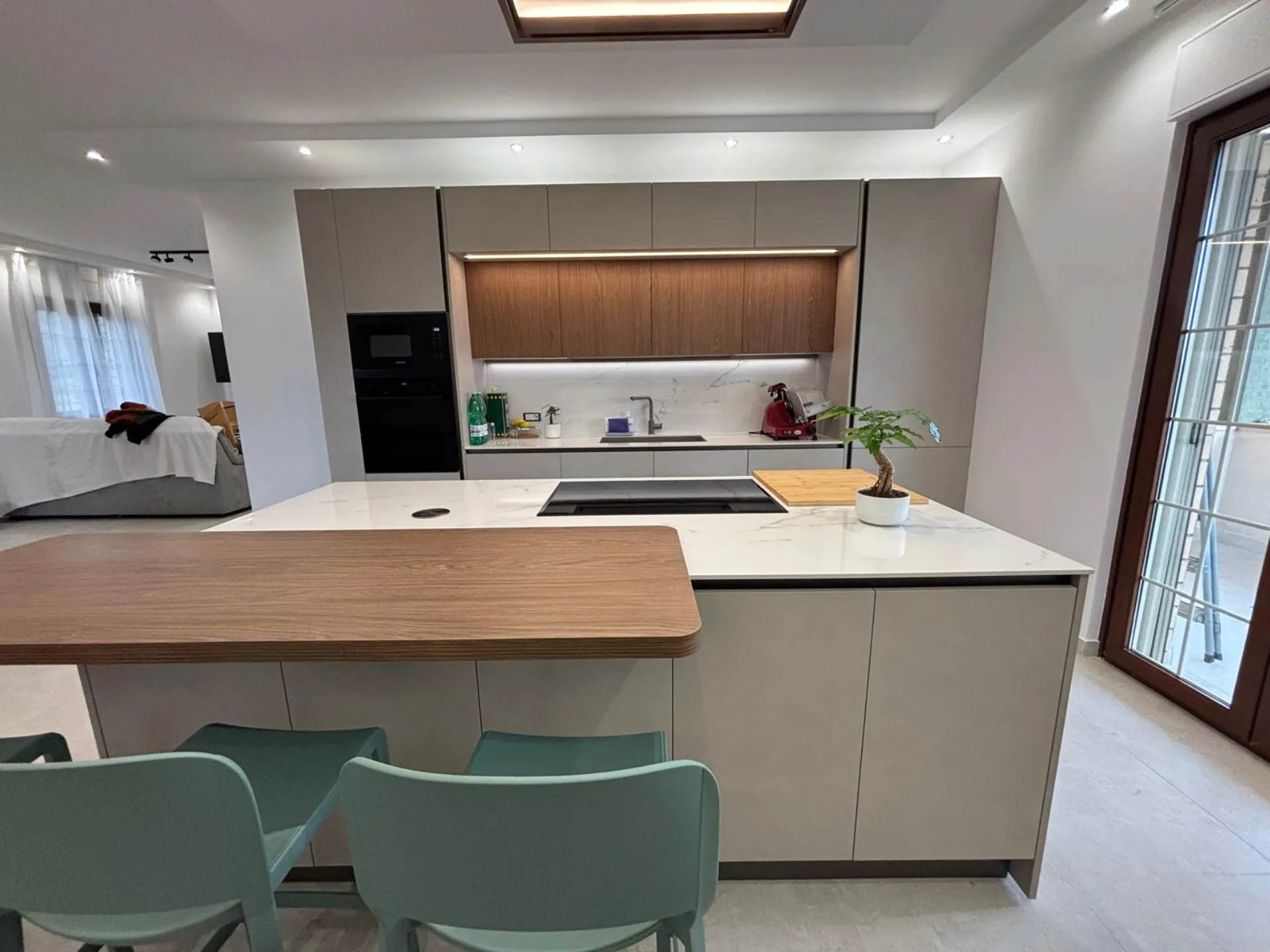 La coerenza stilistica prosegue nella parete attrezzata, che richiama le finiture della cucina arricchendosi di dettagli distintivi: una vetrinetta raffinata e un tocco di verde che dona freschezza e personalità all'intero living.