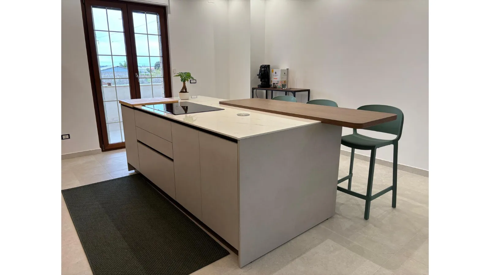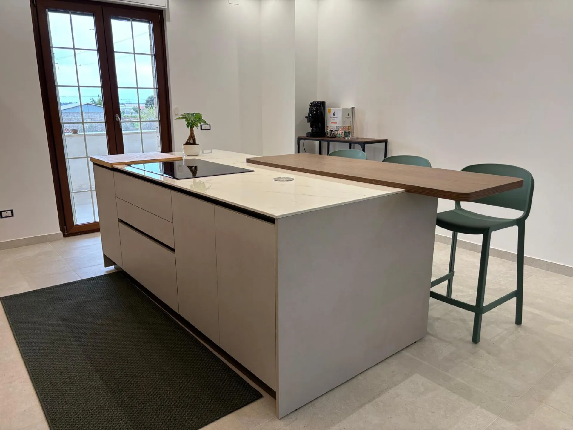 La cucina con configurazione a ponte e isola centrale gioca su un raffinato contrasto materico: le ante in effetto cemento incontrano il calore dell'effetto legno, creando un'atmosfera moderna e accogliente.